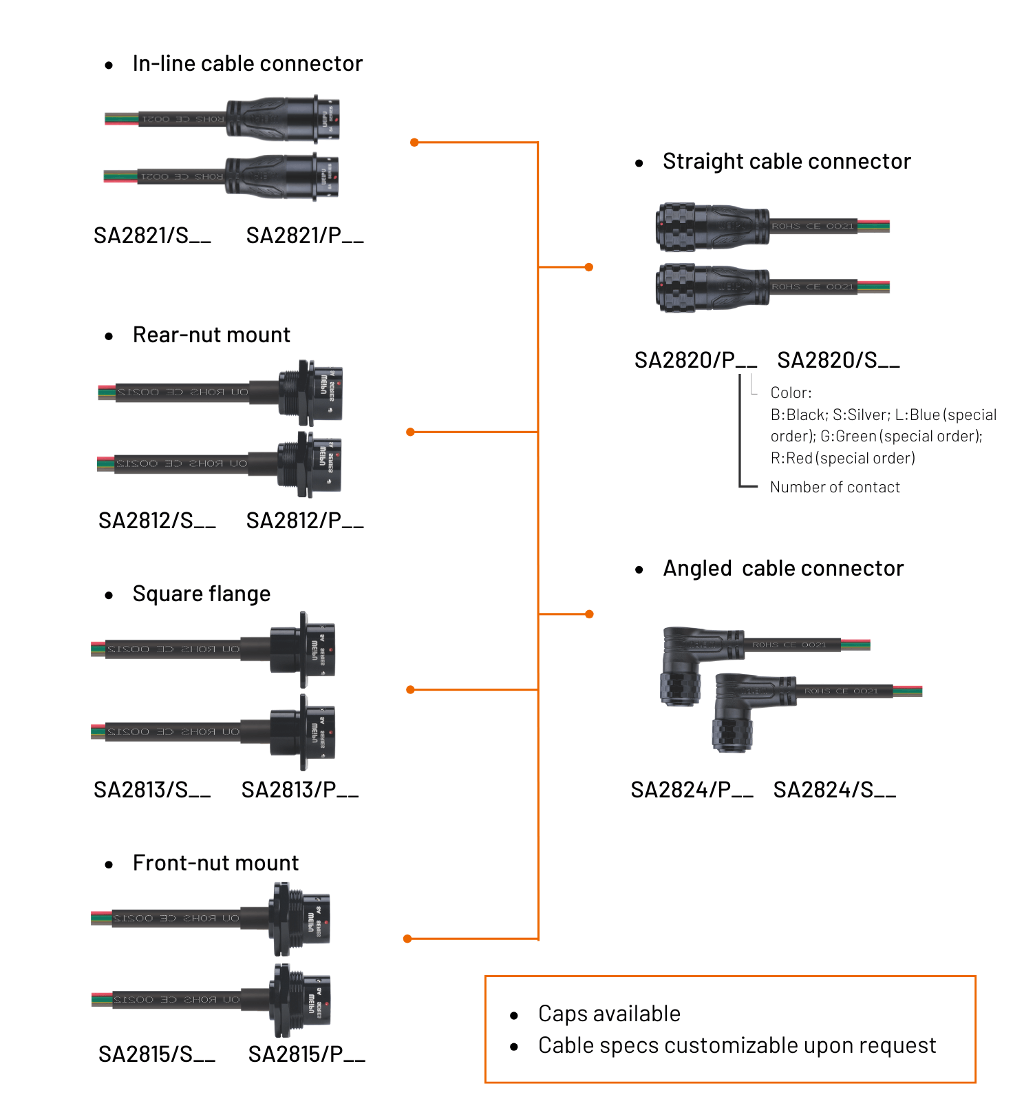 - Flexible Cable Options: Cable length, wire gauge, jacket type, overmold design, and color options
