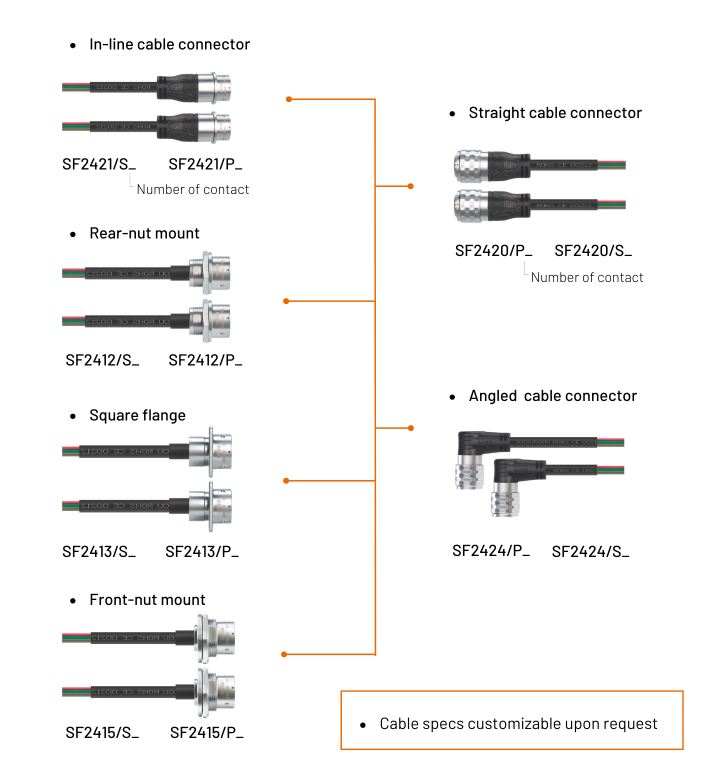 The SF24 with cable assembly is engineered for high-power and signal transmission in: Industrial automation systems, robotics & servo drives, lighting & stage equipment, test & measurement devices, and outdoor control panels, etc.