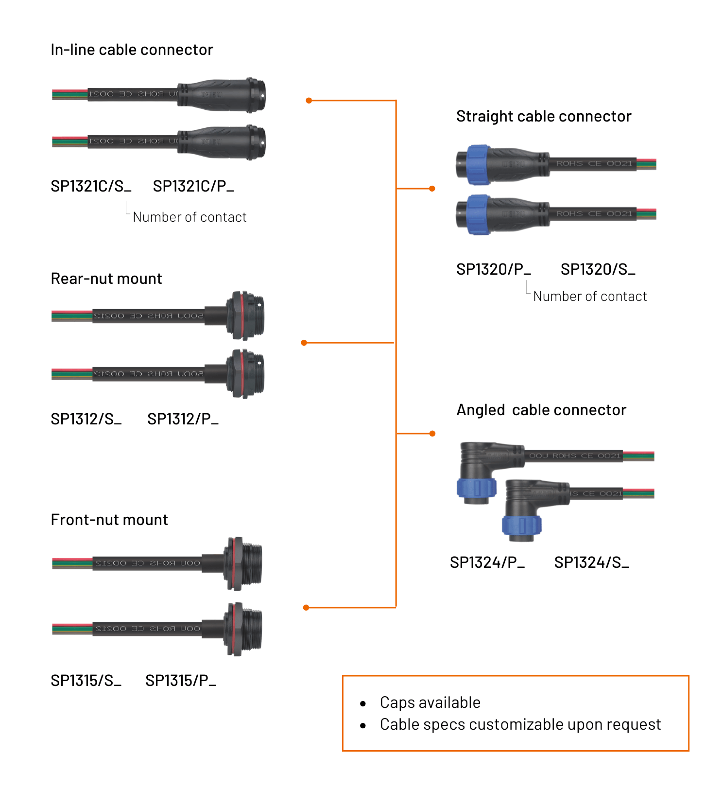 Have options for plug, inline cable connector, panel socket