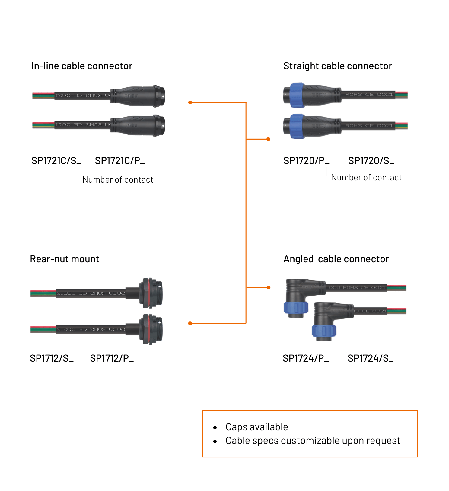 Have options for plug, inline cable connector, panel socket